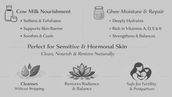 Rooted in Ayurveda, cow milk cools and soothes while ghee deeply nourishes and restores the skin barrier. Together, they create a gentle, hormone-friendly cleanse for face and body.